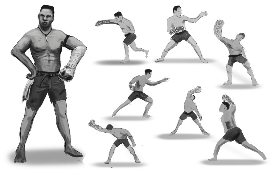A perna dianteira é muitas vezes envolta em um tecido, e a perna envolta é então utilizada para defesa e ataque. A perna de trás desembrulhado também pode ser usado para lançar. Porque nas lutas costumavam ser permitido, e o objetivo do jogo é fazer com que o adversário a cair, pontapés são mais comuns do que costumavam ser.